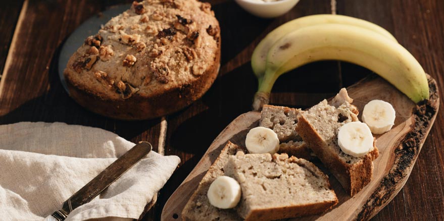 3 bananes mûres + 2 œufs + 100 g avoine + 30 g whey + 100 ml lait + levure → 30–35 min au four.