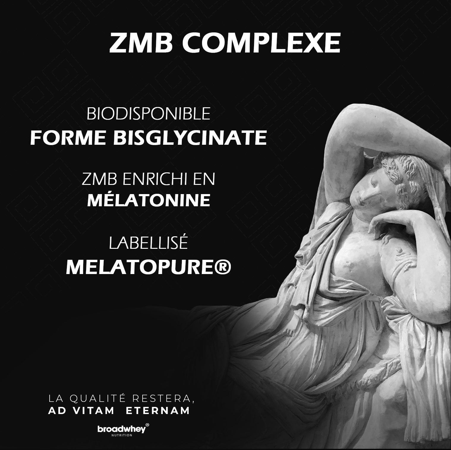 Un ZMA classique associe zinc, magnésium et vitamine B6. Le ZMB Broadwhey ajoute un quatrième actif : la mélatonine MelatoPure®, qui contribue à réduire le temps d’endormissement. Pour un comparatif détaillé, voir notre article : ZMB vs ZMA : lequel choisir pour optimiser ta récupération ?.